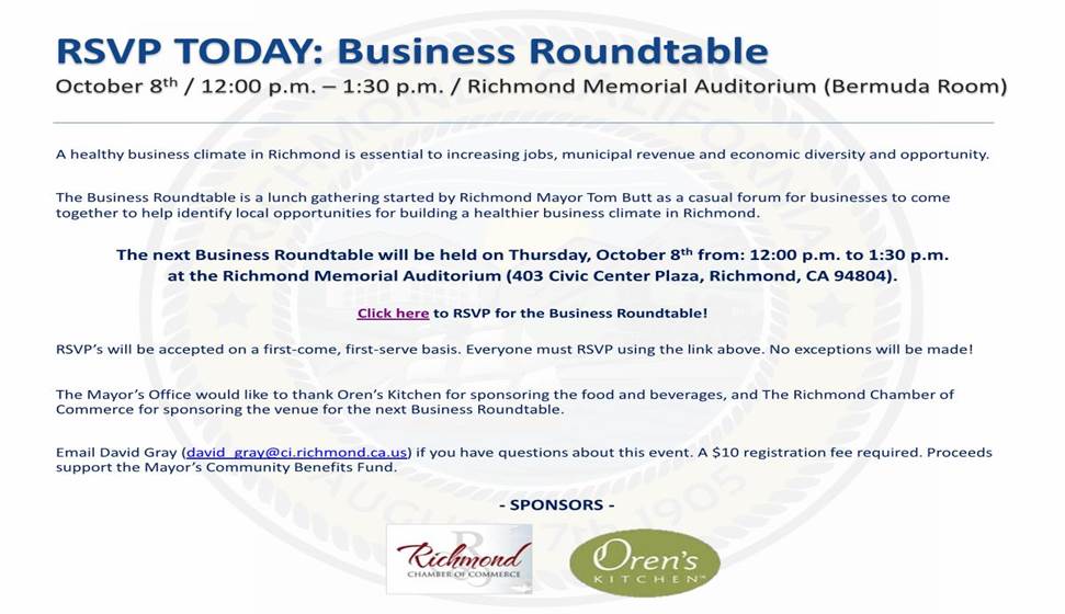 The next Business Roundtable will be held on Thursday, October 8th from 12:00 p.m. to 1:30 p.m. at the Richmond Memorial Auditorium (Bermuda Room, 403 Civic Center Plaza, Richmond, CA 94804). RSVPs online by clicking here. A $10 registration fee is required; proceeds support the Mayor’s Community Benefits Fund.